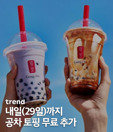 - 4월 28~29일, 오후 2~6시, 공차 매장에서 L사이즈 ICE 음료 주문 시 토핑 1종 무료
